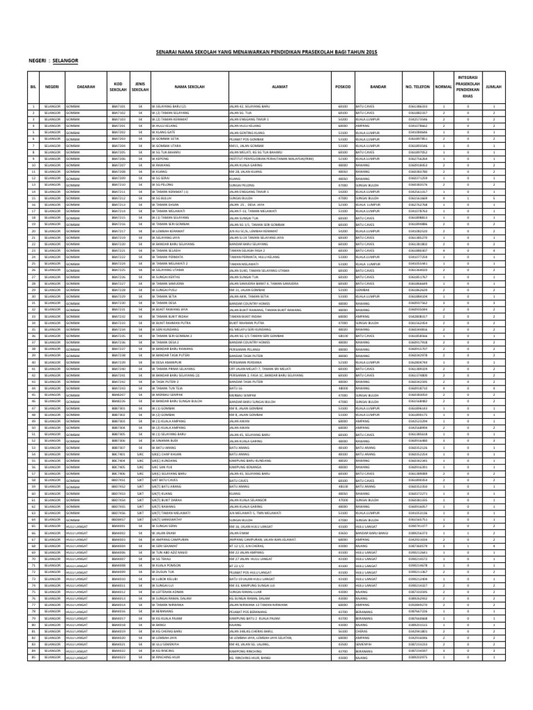 Senarai Sekolah Dan Kelas Prasekolah Negeri Selangor Tahun 2015 Pdf